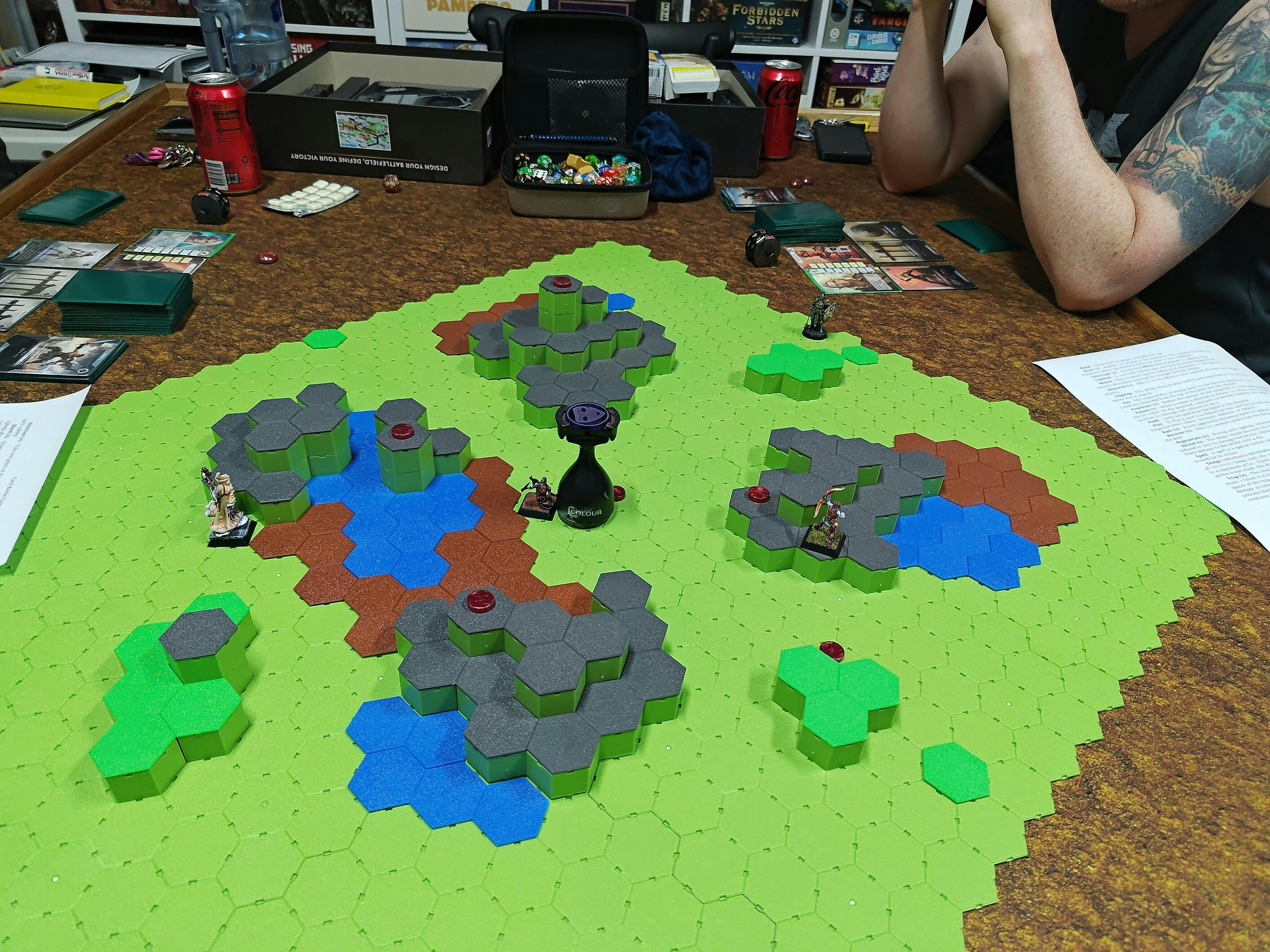 We are developing new deck building card game (Bellum Ultimum), that uses spatial combat on a hexgrid board. TUF32 is perfect this as it's a highly modular system, that has saturated components making it quick to determine terrain types. Quick to assemble and disassemble.