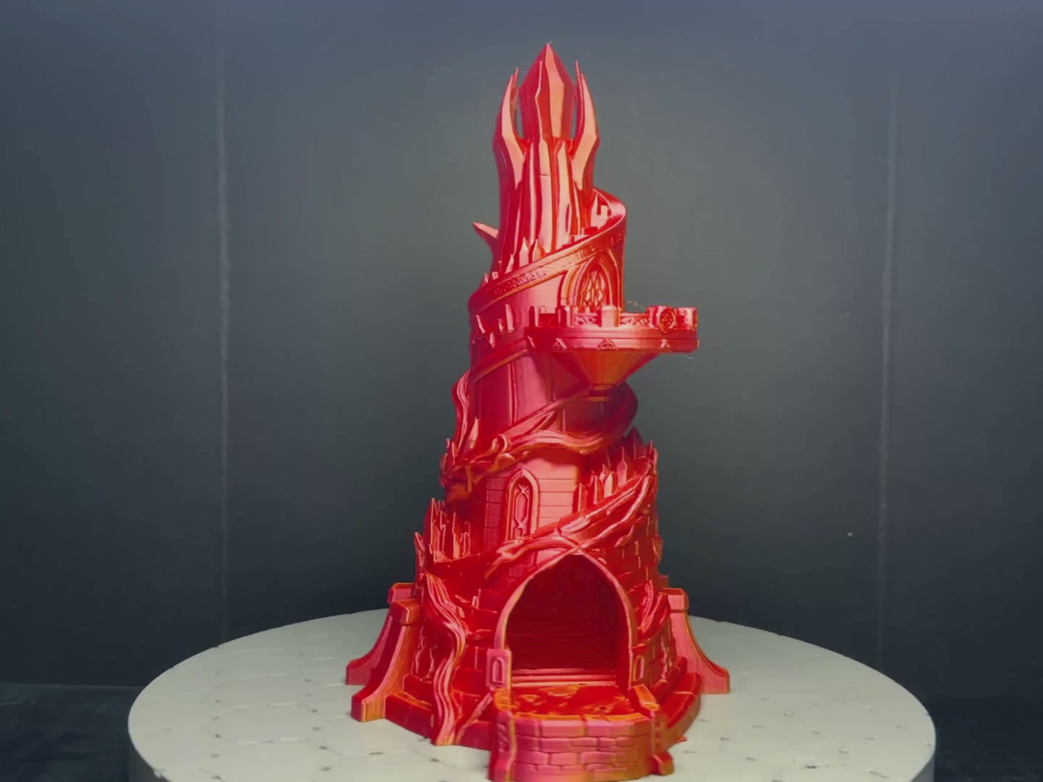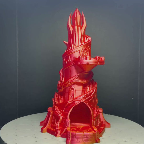 Inspired by towering keeps, magical spires, and flowing arcane energy, dice are dropped into the crown at the top and guided through a smooth internal path before exiting cleanly at the base. No scattered dice. No table bumps. Just controlled, satisfying rolls every time.